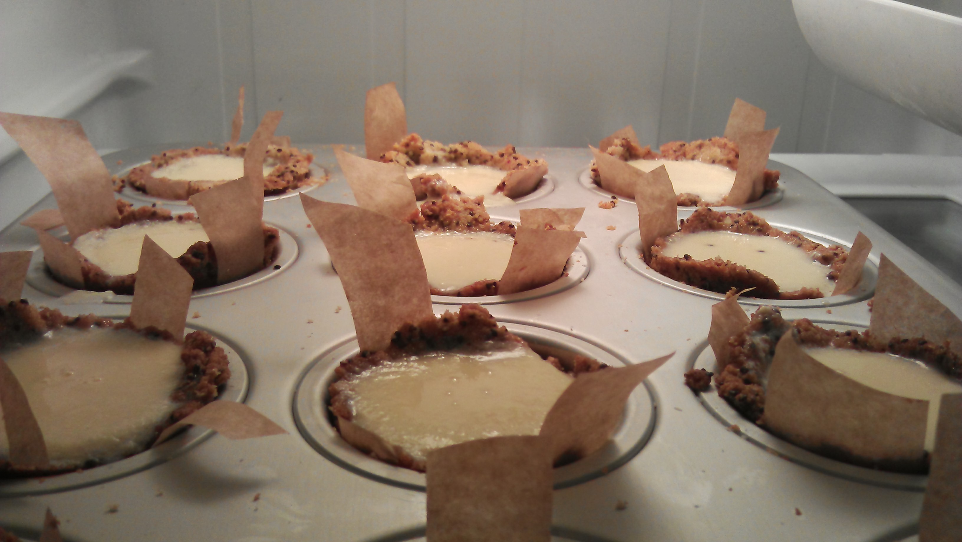 • Take about a tbsp worth of the mixture and push into the muffin try hole/mould. Push the mixture onto the side and try to get an even layer.