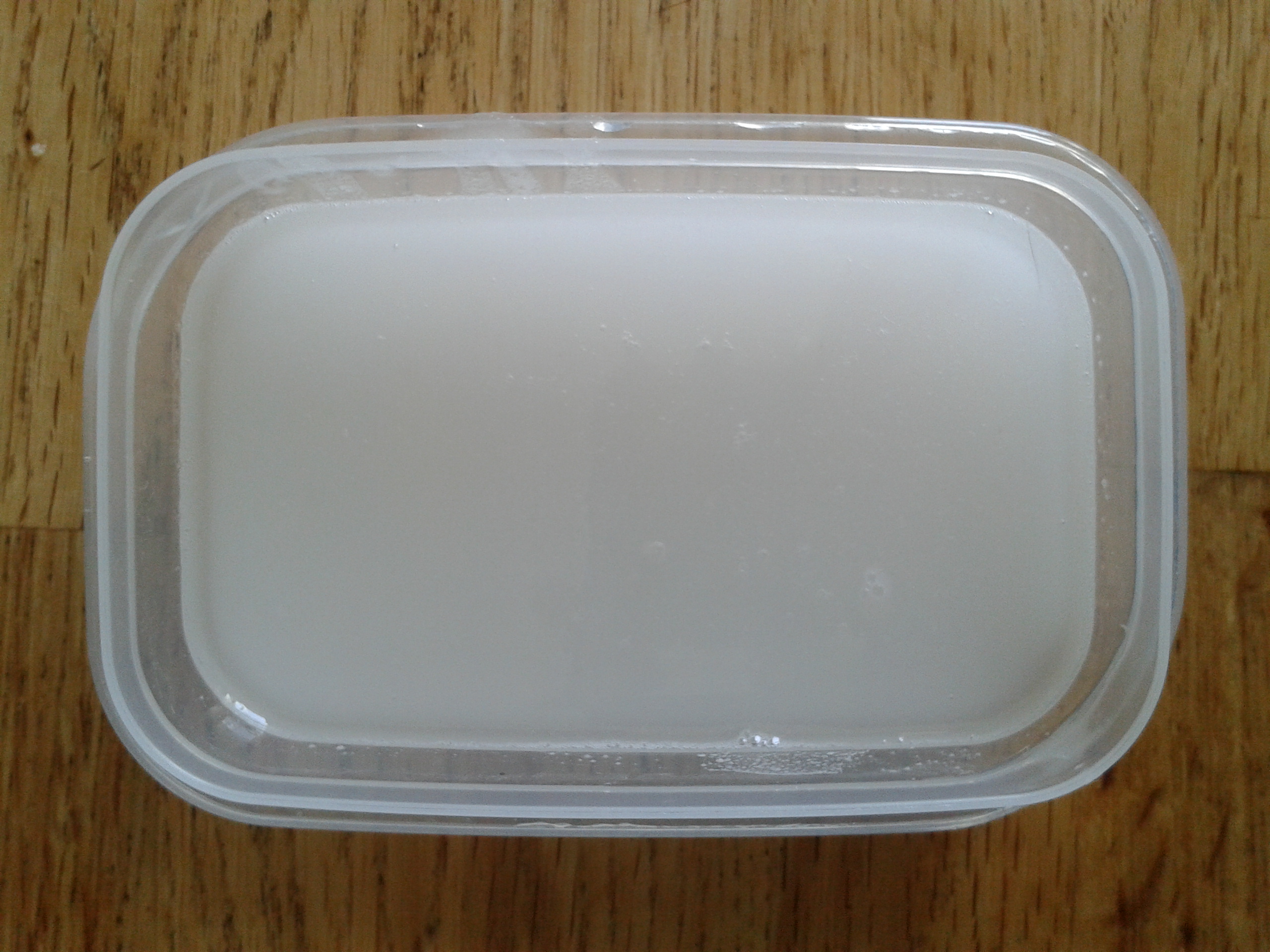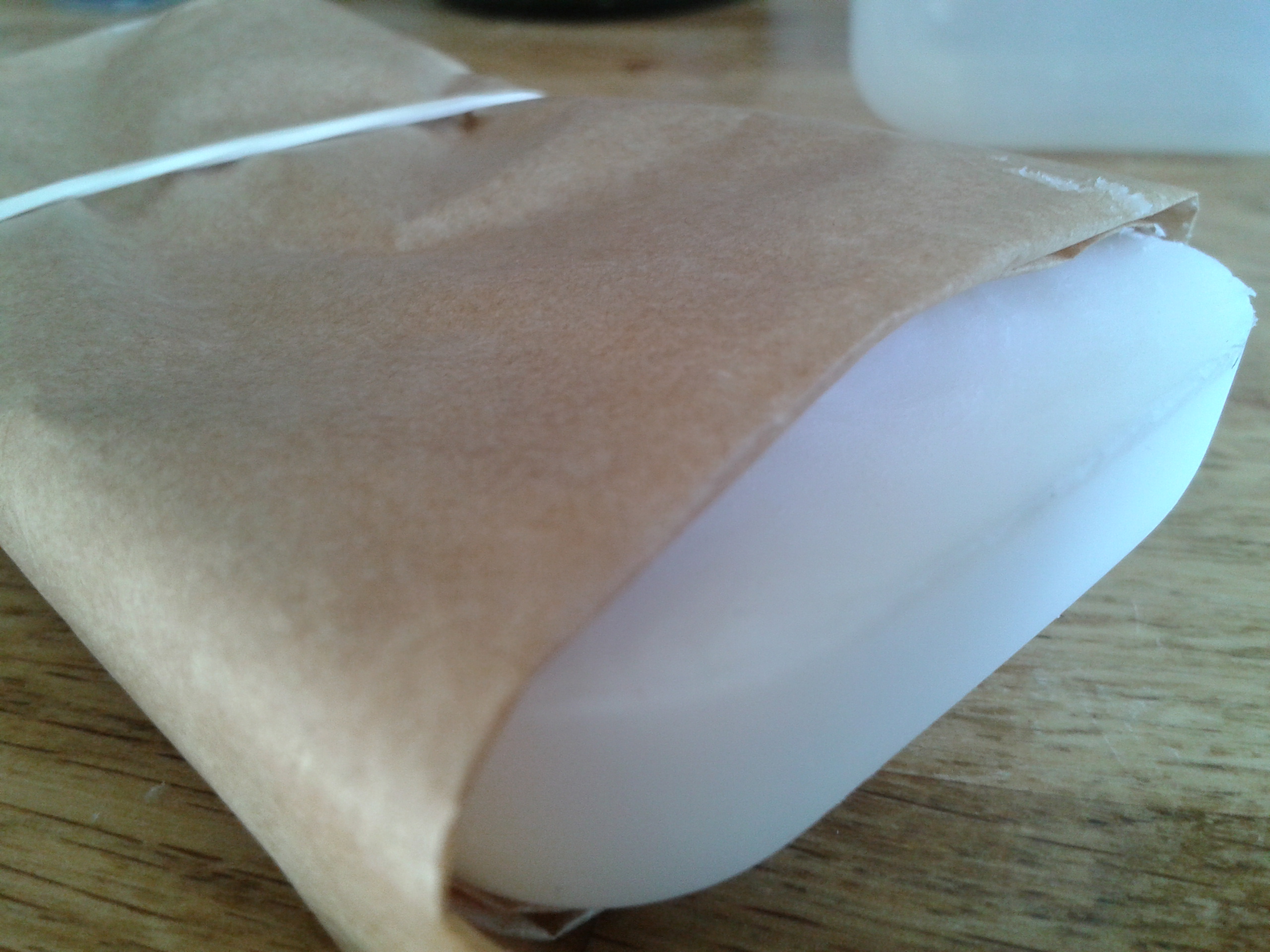 Once set remove from container and wrap in greaseproof paper and secure with an elastic band/string/hair band, as this will protect you hands from getting all oily when applying it.